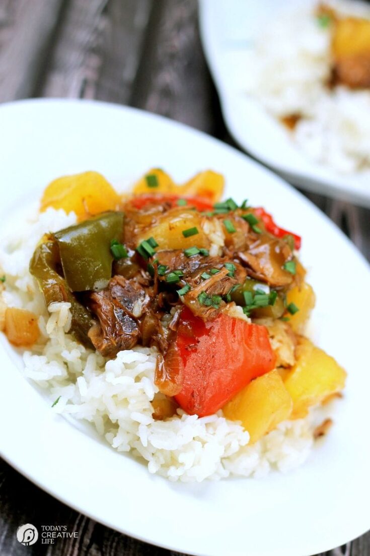 You’re going to want to pin this recipe or even share it on Facebook because it’s THAT kind of recipe! This Slow Cooker Sweet and Sour Island Beefrecipe is great for weekends, week nights and will probably even make your pickiest eaters happy. It’s sweet, it’s tangy and it’s got BEEF and RICE! My husband perks right up when he knows beef is on the dinner menu and me? I love me some rice! Add all the other delicious ingredients and we’re all happy!